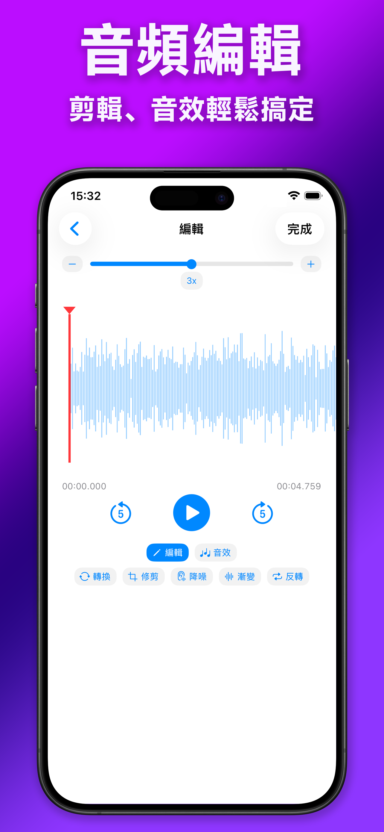 - 進階處理:智能降噪、淡入淡出、音訊反轉(倒放)。